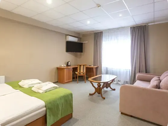 В однокомнатном номере есть всё необходимое для вашего комфортного проживания: две односпальные кровати, письменный стол, стул, багажная тумба, вешалка для одежды, телевизор. В ванной комнате - душ и туалет